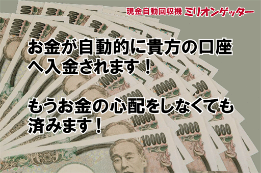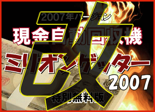 2005年6月に誕生したミリオンゲッター2005は、最終224名の方にご購入頂きました。 そして実践されたほぼ全員が素晴らしい成果を挙げられました。 ご報告いただいた上位20名の購入者様の平均の月収はなんと61万円! 最高の方は100万円をゆうにオーバーするミリオン長者も実際に居られます。 2007年向けのミリオンゲッター2007改は前回のバージョンからなんと6倍パワーアップ! さらに前回15000円だった商材代金をなんと0円!無料配布することにしました! つまり貴方は 全くお金を掛けることなく 『リスクゼロ』で実践することが出来るのです 1円の投資も必要がないのです。 「絶対に失敗しようがない」ビジネスなのです! 現金自動回収機ミリオンゲッター2007改は、貴方の代わりに「ちゃりん、ちゃりん」 と、お金をきちっと口座へ放り込んでくれる可愛いヤツです。 いえ、「ちゃりん」ではなく「バッサッ、バッサッ」とお札を放り込んでくれるのです(笑) 巷で見かける「勝手に稼ぐパソコン」とか「現金自動集金機」とは全然違うシステムです。 恐らく170°位は角度が違うと思いますヨ。 凄すぎます!! このミリオンゲッター2007改を貴方のPCへ設置するには速い方で1時間、 超初心者の方でも4時間もあれば、設置が可能です。 そしてその日から稼動も可能なのです。 あとは寝て待つだけ、 ミリオンゲッター2007改が毎日自動的に回収してきます。 あとは、1日たった30分程度簡単な作業があるだけ! メンテナンスも月に数回1時間程度するだけです。 こんな楽して大金を回収出来るシステムってありました? なんか夢のようですネ!でも夢ではありません。 現実なんです。もちろん違法な行為など一切ありません。安心して取り組んで下さい。 ※クリックで出た窓で「保存」、または右クリックして「対象をファイルに保存」してください。 保存したファイルを解凍すると、内容がごらんいただけます。 解凍ソフトはこちら ★ダウンロードが始まらない時...[HELP] ![]() ★現金自動回収機ミリオンゲッター2005を購入者の 皆さんからうれしいお声が届いています。(一部抜粋)